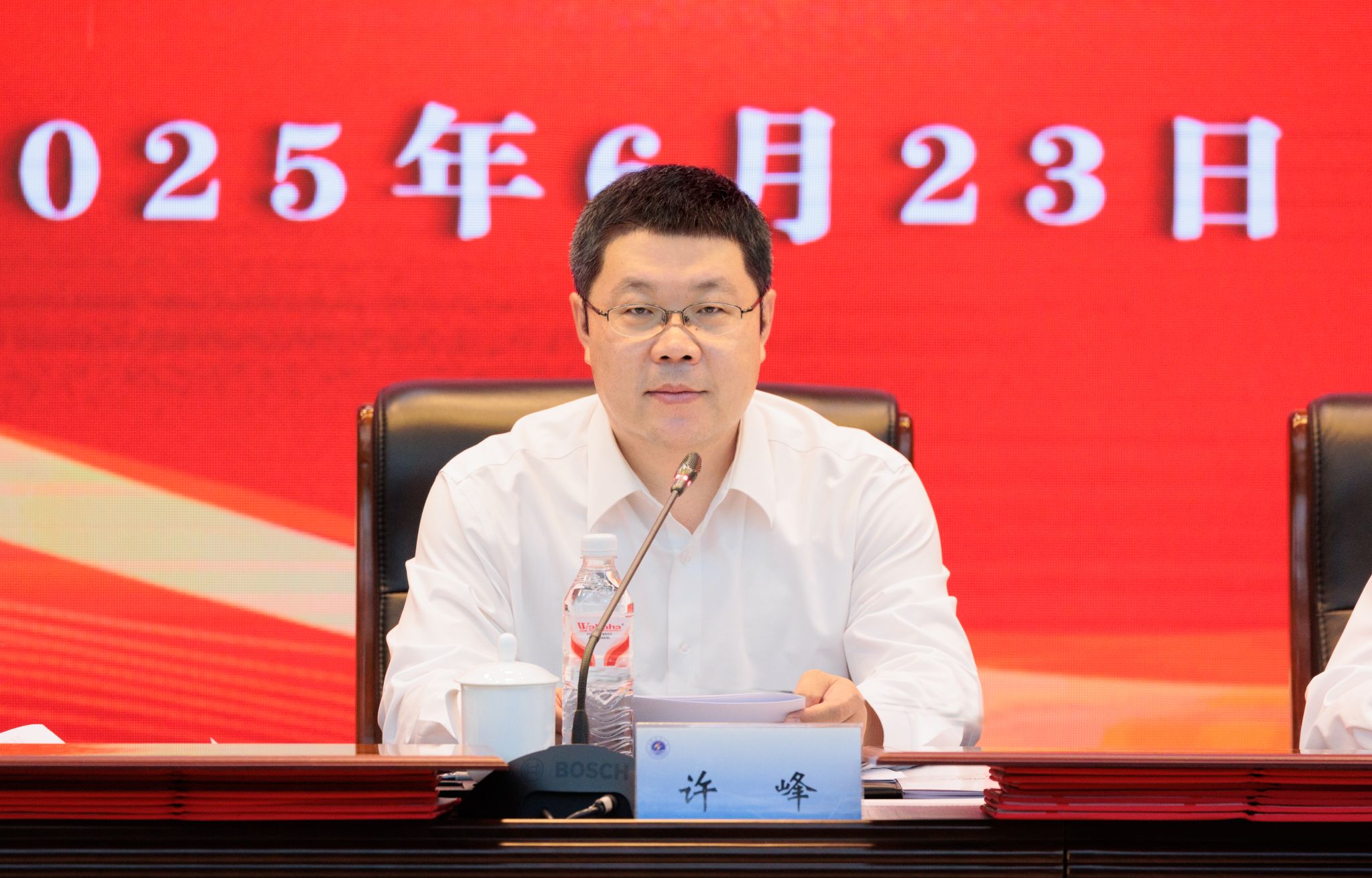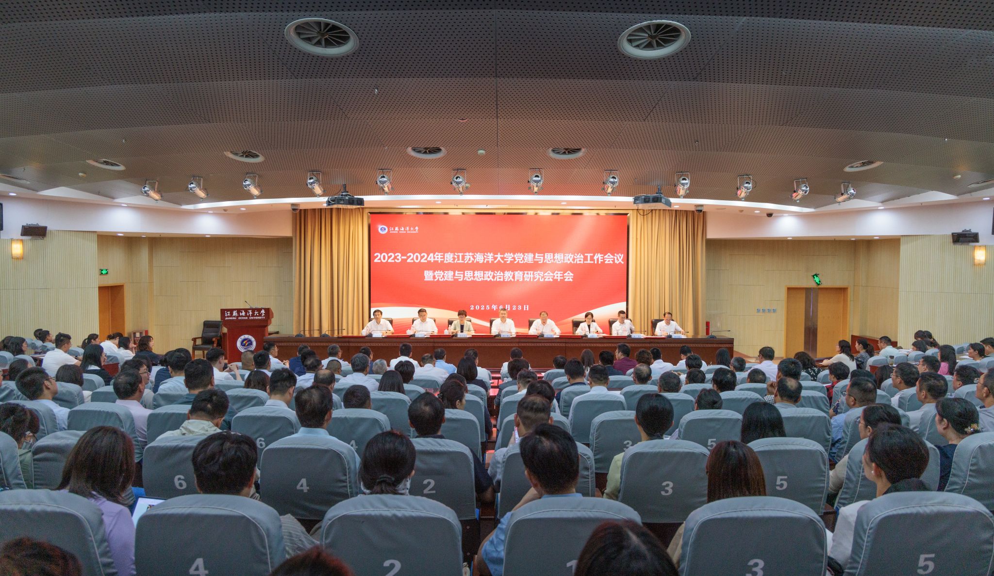 6月23日下午,学校2023-2024年度党建与思想政治工作会议暨党建与思想政治教育研究会年会在会议中心黄海厅召开。校党委书记许峰出席会议并讲话。校党委副书记、校长汤建主持会议。