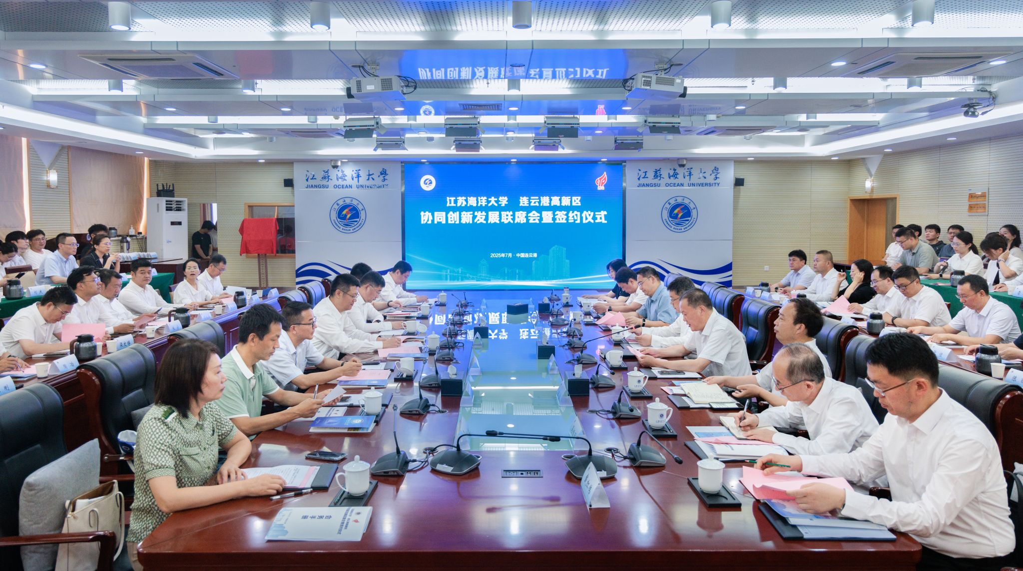 双高协同聚力,两创融合发展。7月4日,江苏海洋大学—连云港高新区协同创新发展联席会在会议中心东海厅举行。双方就共建产业协同发展中心,推动双高协同融合发展签署一揽子合作协议。校党委书记许峰,校长汤建,海州区委书记、高新区党工委书记李锋,校党委常委、副校长申欣出席会议。会议由汤建主持。
