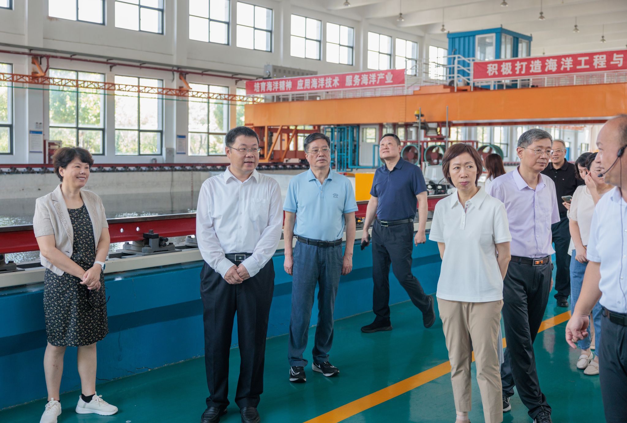 在海洋工程技术研究中心,代表们先后参观了智能海洋探测无人船、海洋风浪流水池和环形波流水槽等关键实验设施,了解设备运行情况。中心负责人汇报了平台支撑人才培养、服务学科竞赛,开展科学实验检测等方面的情况,以及在船舶智能制造、海洋资源开发技术与装备、海洋生物医药等领域所取得的突破性进展和代表性成果。代表们认真聆听介绍,就实验装备的技术原理、应用效果及产业化前景与工作人员深入交流,对中心将科研创新与地方实际需求紧密结合的做法表示赞赏。