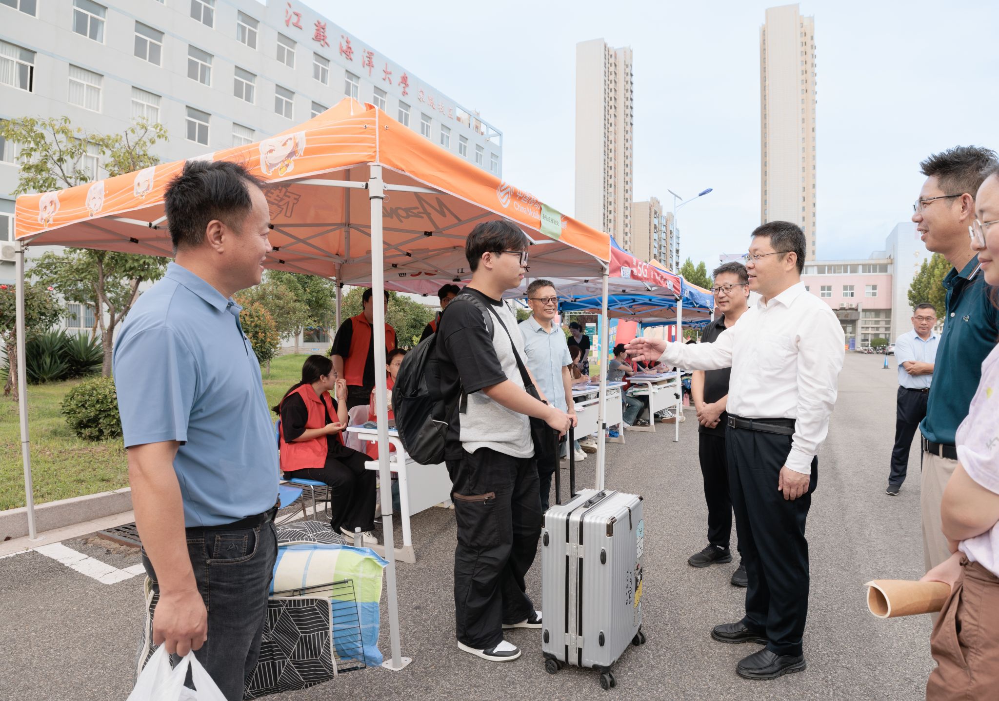 “你从哪里考来的?”“你学习的是什么专业?”许峰仔细询问新生的入学志向,欢迎他们来到江海大学习生活。他勉励各位新生要厚植家国情怀,筑牢信仰根基,锤炼进取品格,勇于担当时代赋予的使命与责任。他希望新生们能够尽快适应新环境,珍惜大学时光,努力提升自身的综合素质和能力,在求学道路上,不断追求卓越,绽放青春光彩。