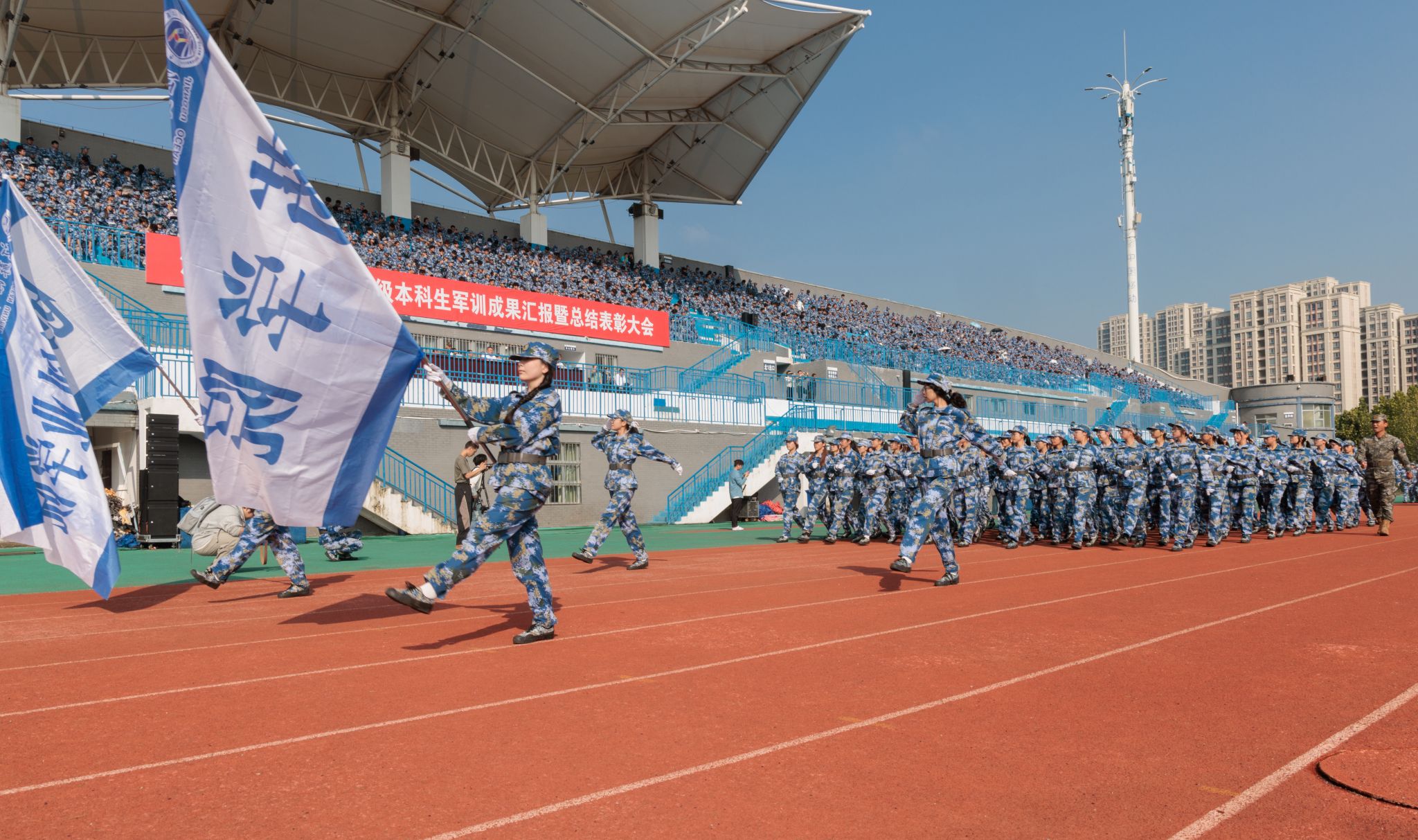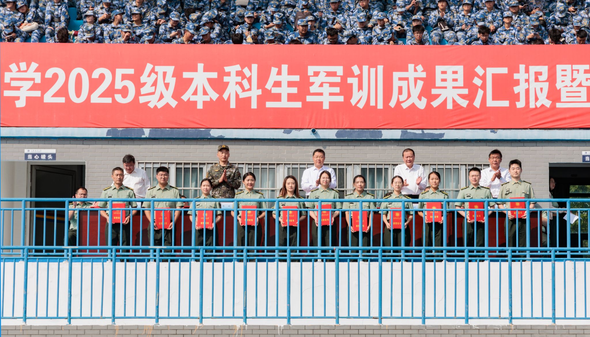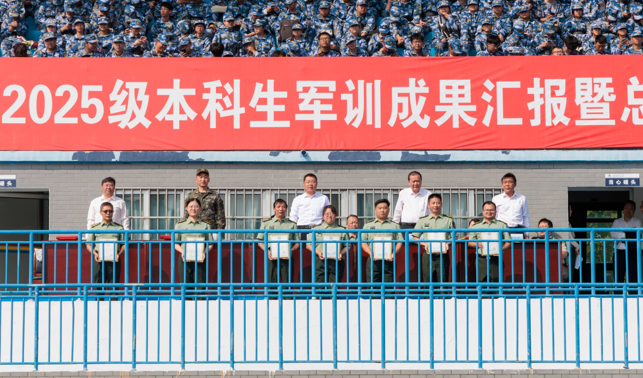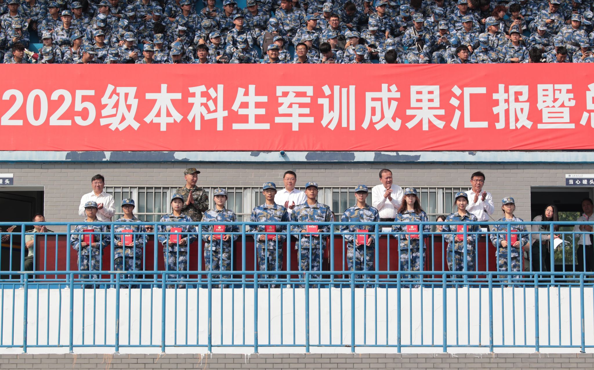 9月20日上午,时值第25个全民国防教育日,我校2025级本科生军训成果汇报暨总结表彰大会在苍梧校区东运动场举行。校党委书记许峰,校长汤建,副校长、2025级本科生军训旅旅长郑利军,副校长、2025级本科生军训旅政委马廷淮出席大会。承训部队武警连云港支队副参谋长张鹏及全体教官,校军训工作领导小组成员,军训指导员和2025级军训学员共同参会。郑利军主持大会。