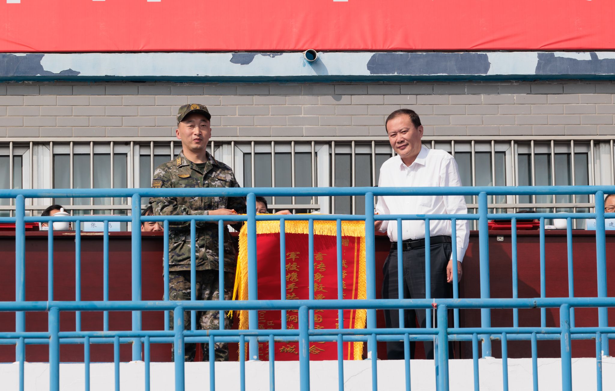 汤建代表学校向承训部队武警连云港支队赠送锦旗。