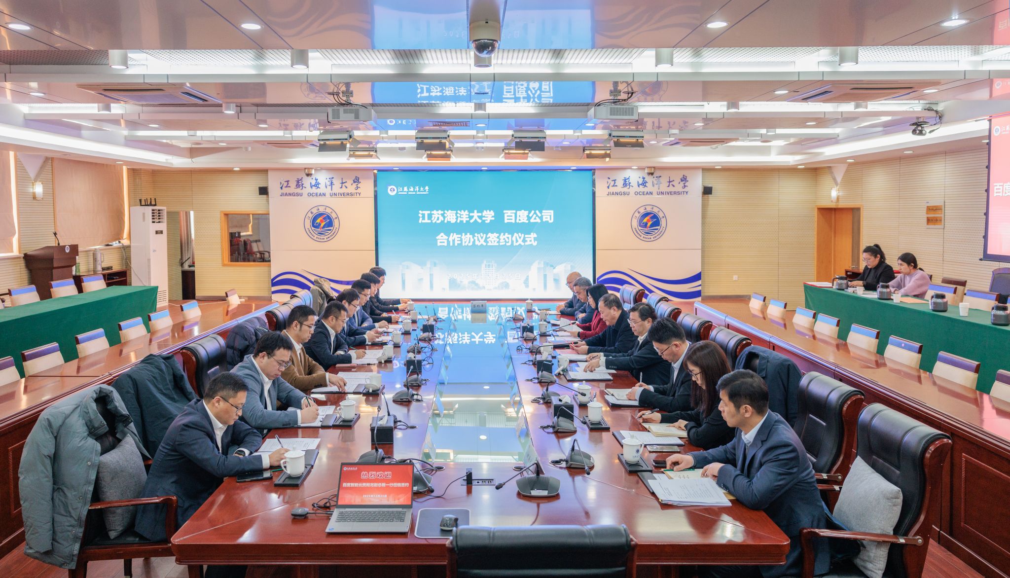 为进一步深化校企合作,推动人工智能技术与高等教育融合发展,12月25日,学校与百度公司在会议中心东海厅签署战略合作协议,共建智慧海洋学院。百度智能云副总裁贾殿龙、校长汤建出席签约仪式。仪式由副校长马廷淮主持。