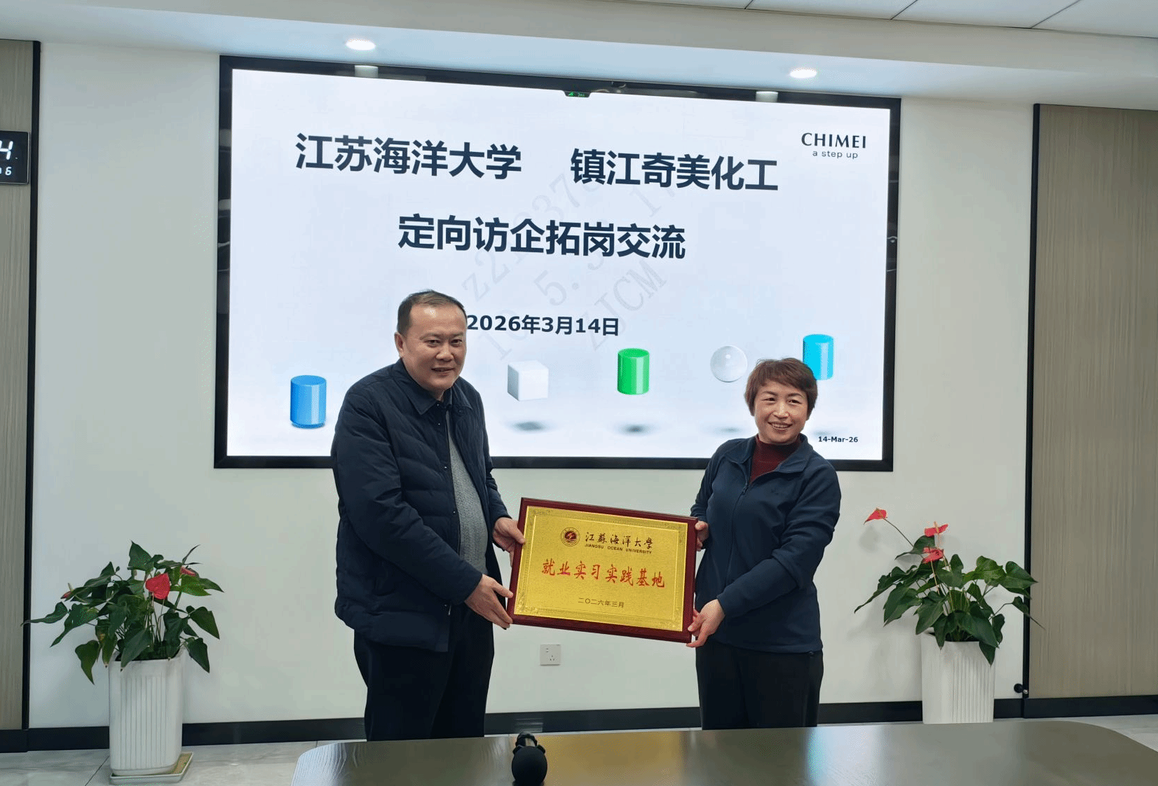 学校在奇美化工有限公司建立了就业实习实践基地,汤建与公司行政管理部经理张金莹共同为基地揭牌。