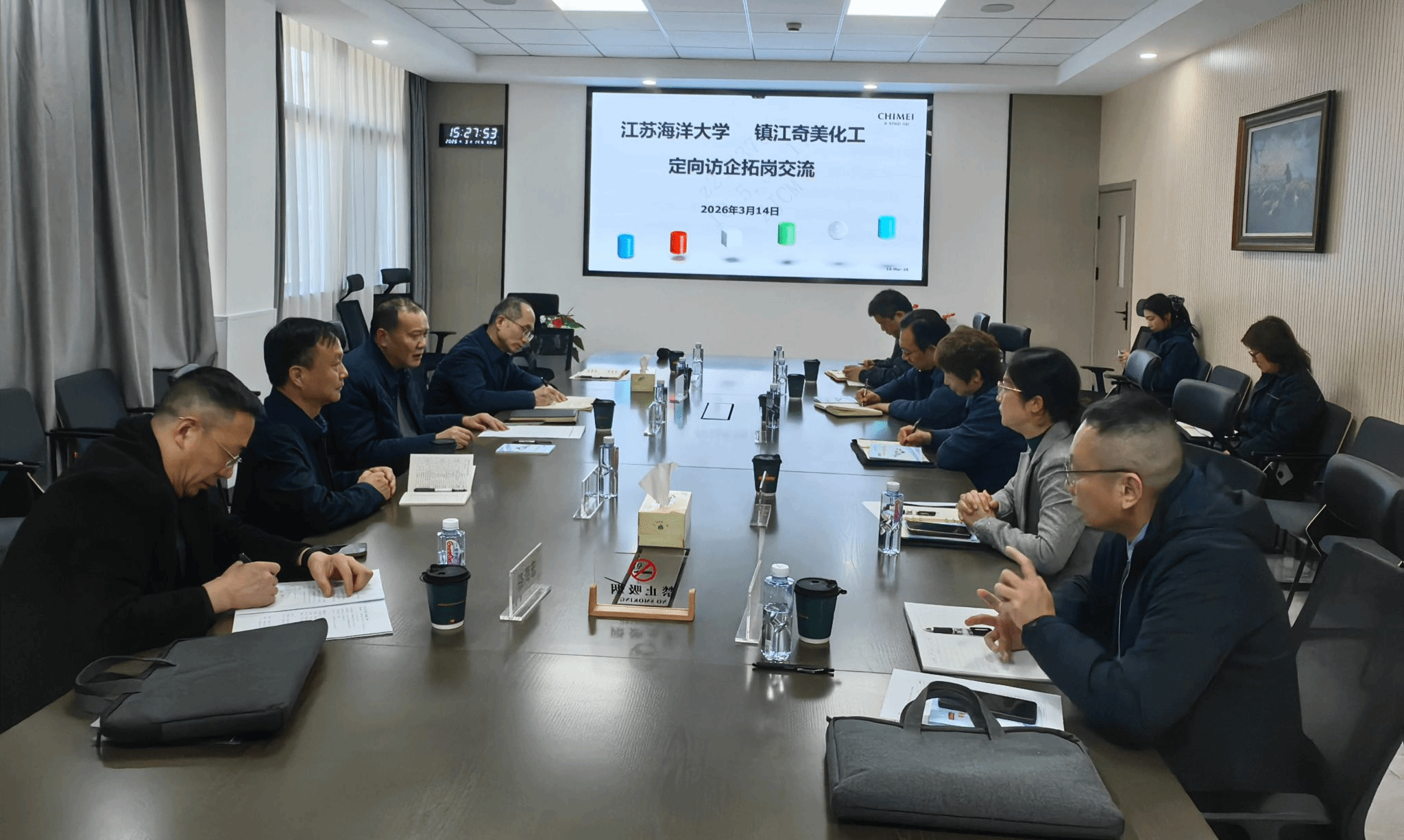 镇江市人力资源市场管理办公室主任赵蕾详细介绍了镇江人才引进政策和重点产业人才需求情况。学校招生与就业处、环境与化学工程学院、机械工程学院等相关学院负责同志结合企业需求,重点推介了与参访企业专业高度匹配的毕业生信息。双方就建立常态化人才供需对接机制,助力推动人才培养与企业需求精准对接进行了深入探讨。