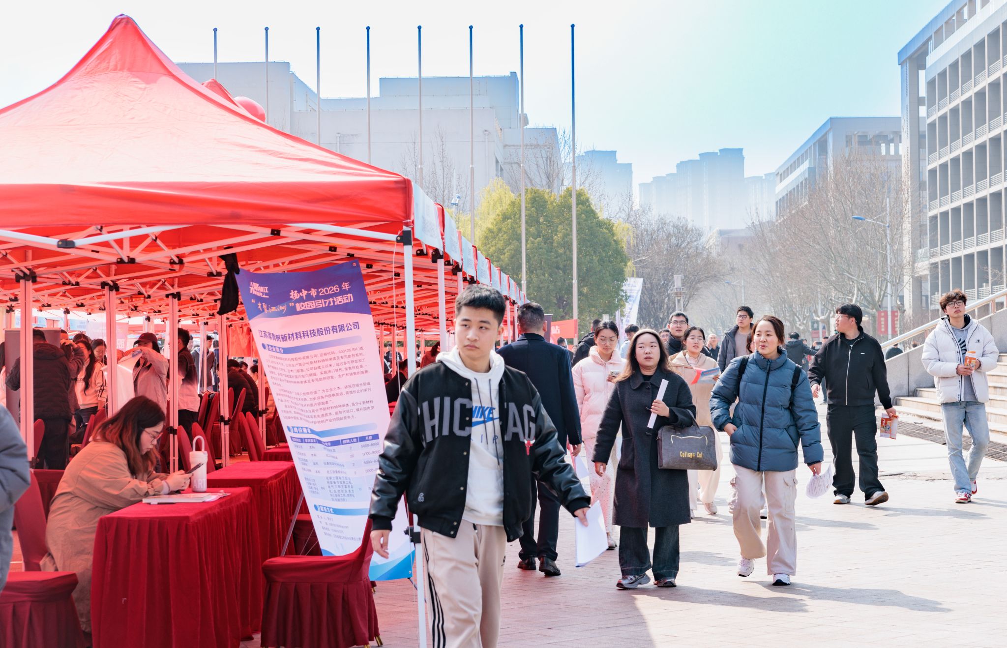 现场设置了南通、无锡、镇江、昆山、徐州、常熟等地方专区,以及海洋装备、智能装备、生物医药、化工材料、金融服务、信息技术等十余个行业专区,实现专业与岗位的精准匹配,方便学生高效对接心仪企业。招聘会吸引了大量2026届毕业生踊跃参与,不少低年级学生也前来观摩学习,提前了解就业市场。