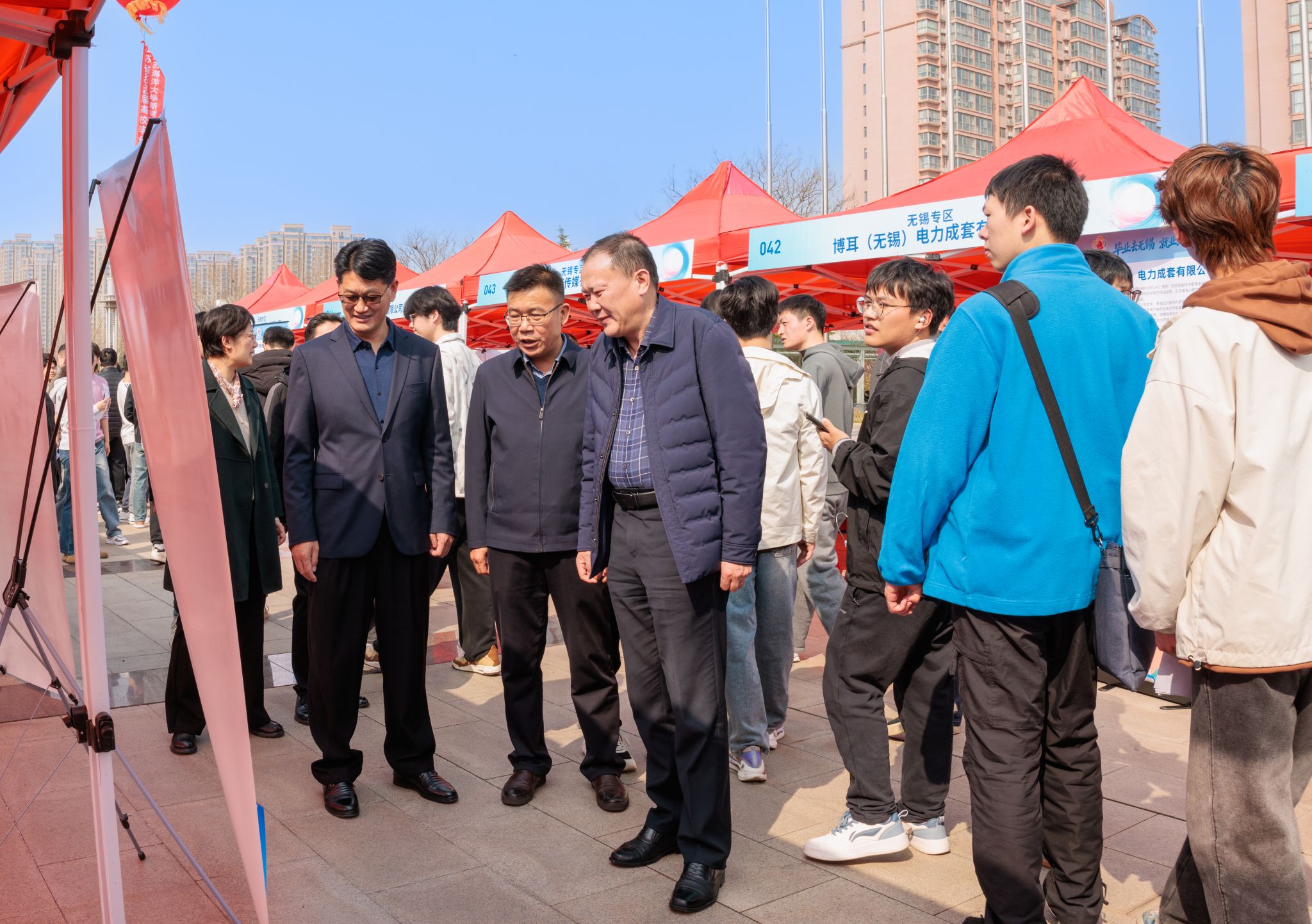校长汤建、副校长郑利军、江苏省高校招生就业指导服务中心副主任蔡亮到现场,与用人单位和毕业生深入交流,了解企业人才需求和学生求职情况。