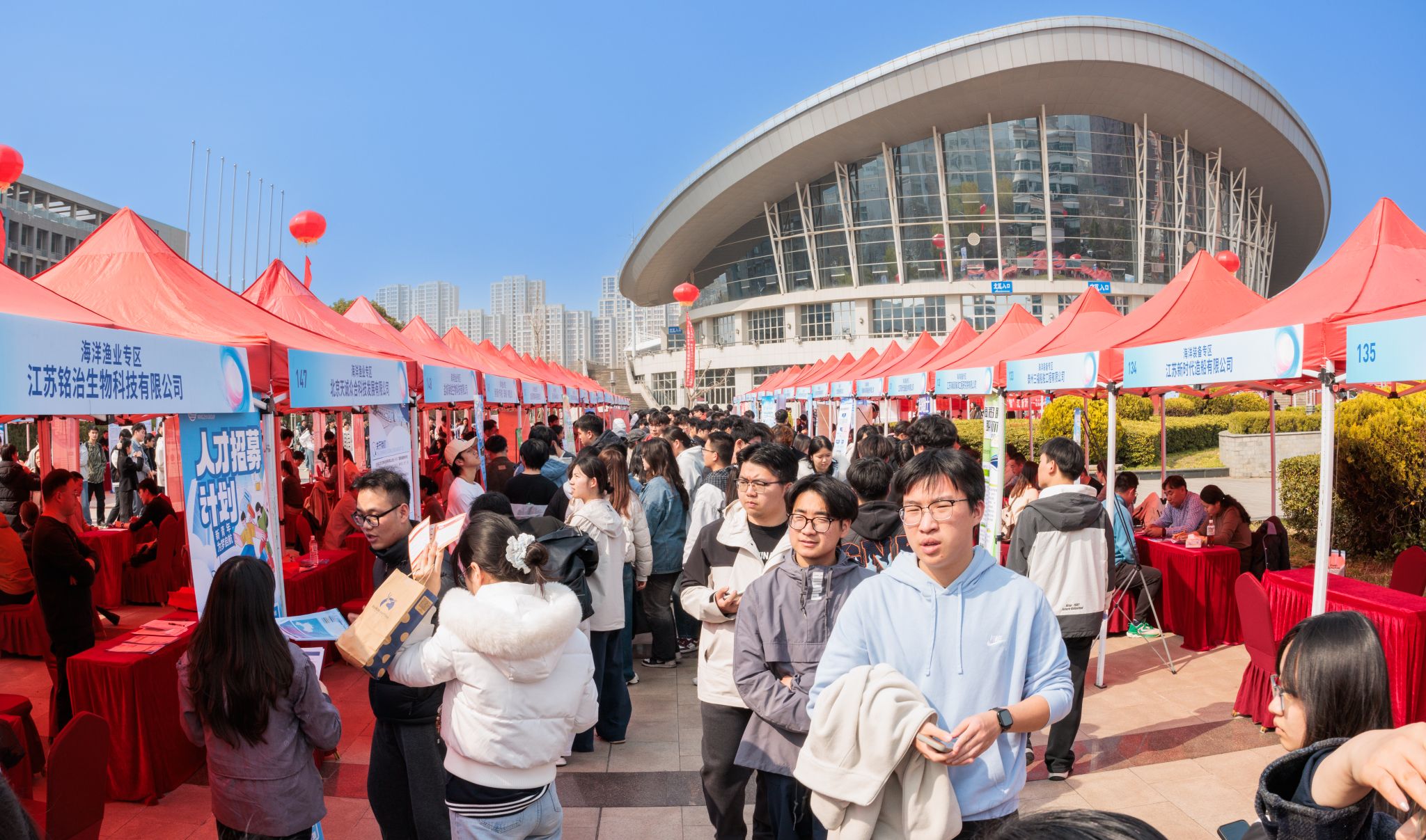 作为江苏省2026届高校毕业生春季促就业攻坚行动的重要组成部分,本次招聘会参会企业数量多、岗位质量高、行业覆盖广。251家用人单位涵盖新材料、高技术船舶、海工装备、智能制造、生物医药、金融服务、信息技术等十余个行业领域,既有中天科技、大全集团、中复神鹰碳纤维股份有限公司、中国工商银行等知名企业,也有鲁南制药、江苏新时代造船、恒力重工、益海嘉里等行业龙头。