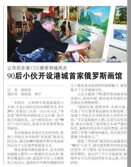 本报讯 白桦林中炊烟袅袅的小木屋,天高云淡的贝加尔湖畔风光,3月29日,在秦东门大街一方山水小区,“伟奇诺”俄罗斯风情画馆正式开展。你可能不知道的是,这个画馆是由一位“90后”小伙开设的,是我市首家俄罗斯风情画馆。
