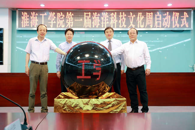 央广网南京6月9日消息(通讯员金芙蓉 记者景明)6月8日是联合国确定的世界海洋日和我国海洋宣传日。8日上午,淮海工学院会议中心东海厅内,校党委书记赵炳起,校长史金飞,副校长舒小平、王洪法共同触摸水晶球,闪烁着“淮海工学院”字样的水晶球随之亮起,标志着该校首届海洋科技文化周正式启动。