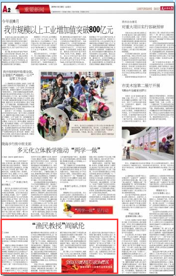 参加工作以来,阎斌伦始终把鱼池虾塘作为自己教学和科研的“第一实验室”,做给渔民看、教会渔民干、帮着渔民赚,用亲身的实践引导江苏沿海的养殖户利用滩涂、池塘进行鱼虾蟹贝等综合养殖,取得了丰硕成果,被沿海渔民亲切地称为“渔民教授”。“我们碰到技术上的问题,一个电话打过去,阎教授就赶到了。有一年夏天,我的塘子里对虾生病,阎老师凌晨5点钟就赶到了塘边。他是个拿工资的高校老师,但对我们渔民的指导至今坚持分文不取。”赣榆的养殖户张庆起告诉记者。