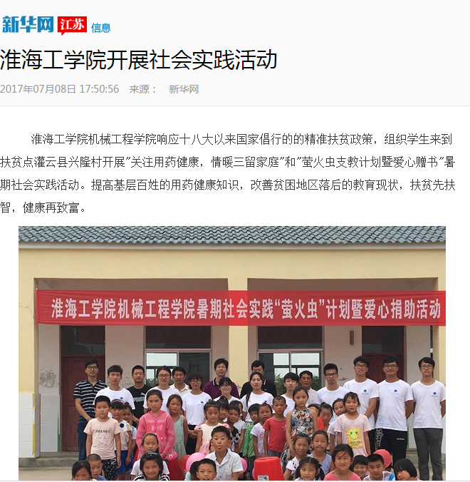 淮海工学院机械工程学院响应十八大以来国家倡行的的精准扶贫政策,组织学生来到扶贫点灌云县兴隆村开展"关注用药健康,情暖三留家庭"和"萤火虫支教计划暨爱心赠书"暑期社会实践活动。提高基层百姓的用药健康知识,改善贫困地区落后的教育现状,扶贫先扶智,健康再致富。
