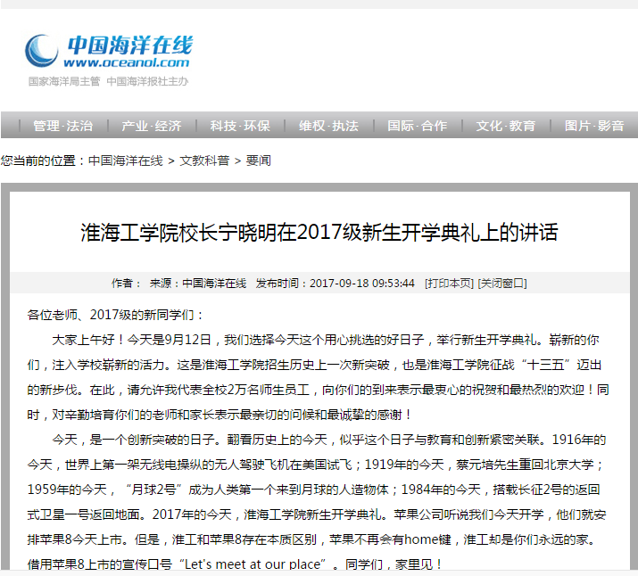 淮海工学院校长宁晓明在2017级新生开学典礼上的讲话