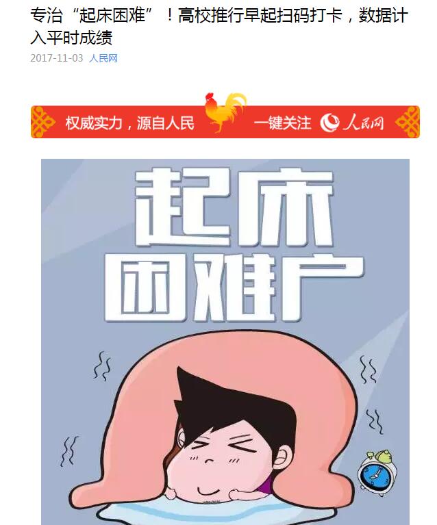 “晚起床很大程度上会导致学生上课迟到、精神不振等课堂现象,早起打卡后,大学生可以按时吃早餐、自习,较早调整好状态,迎接课堂学习。”朱国军说,“帮助和引导青年学生就是我们的工作,利用‘互联网+’这样便捷的手段和方法,更增强了工作的有效性,有助于我们补齐工作对象认识上的短板,更好关注那些起床困难户”。