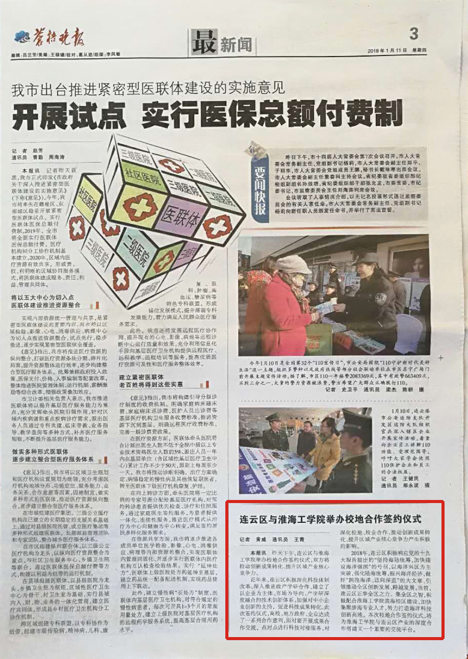 昨天下午,连云区与淮海工学院举办校地合作签约仪式,双方将推动创新成果转化、提升区域产业核心竞争力。