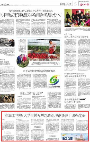 学校党委高度重视思想政治理论课教学综合改革,制定并实施了《淮海工学院思想政治理论课教学综合改革方案》,校党委书记赵炳起亲自给大学生上思想政治理论课,校长宁晓明每月与大学生进行一次“宁校有约”的交流座谈。