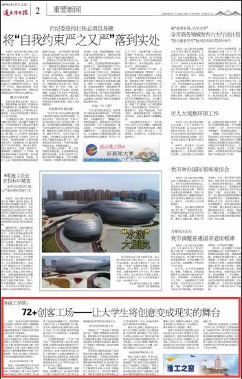 淮海工学院持续推进大学生创新创业教育。孙悟空有72般变化,72+创客工场则提供了将大学生创客72 Plus的创意变为现实的舞台。72+创客工场总投资400多万元,使用面积1100平方米,以“智能制造”为主题,设有5个创新设计室(智能科技、机器人、机电、无人机与航模、3D打印等创新分室),1个公共制作区,1个路演报告及讨论区。