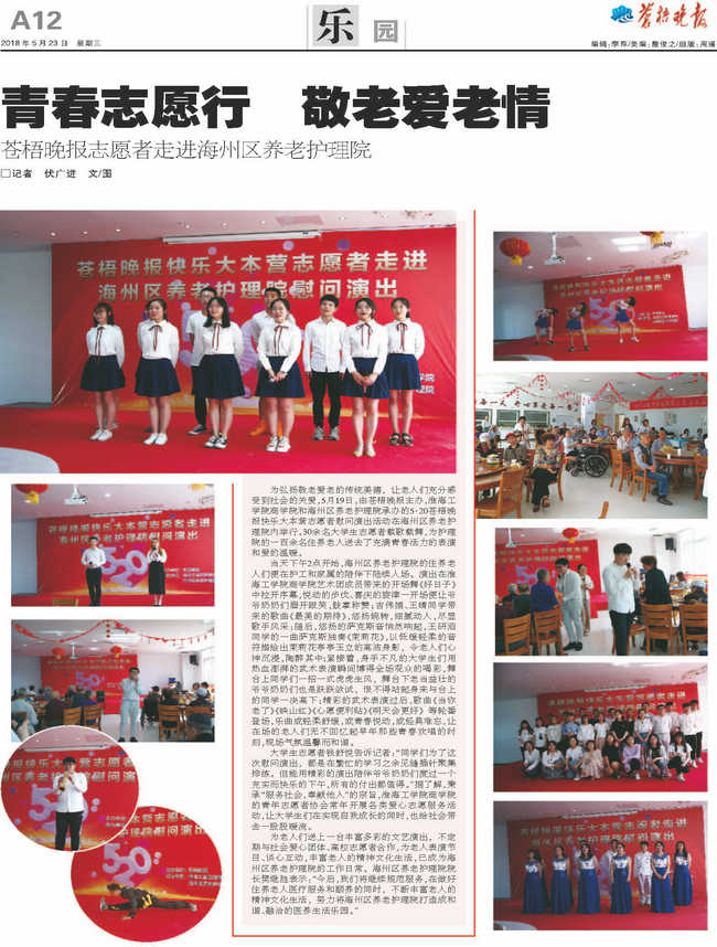 为弘扬敬老爱老的传统美德,让老人们充分感受到社会的关爱,5月19日,由苍梧晚报主办,淮海工学院商学院和海州区养老护理院承办的5·20苍梧晚报快乐大本营志愿者慰问演出活动在海州区养老护理院内举行。30余名大学生志愿者载歌载舞,为护理院的一百余名住养老人送去了充满青春活力的表演和爱的温暖。