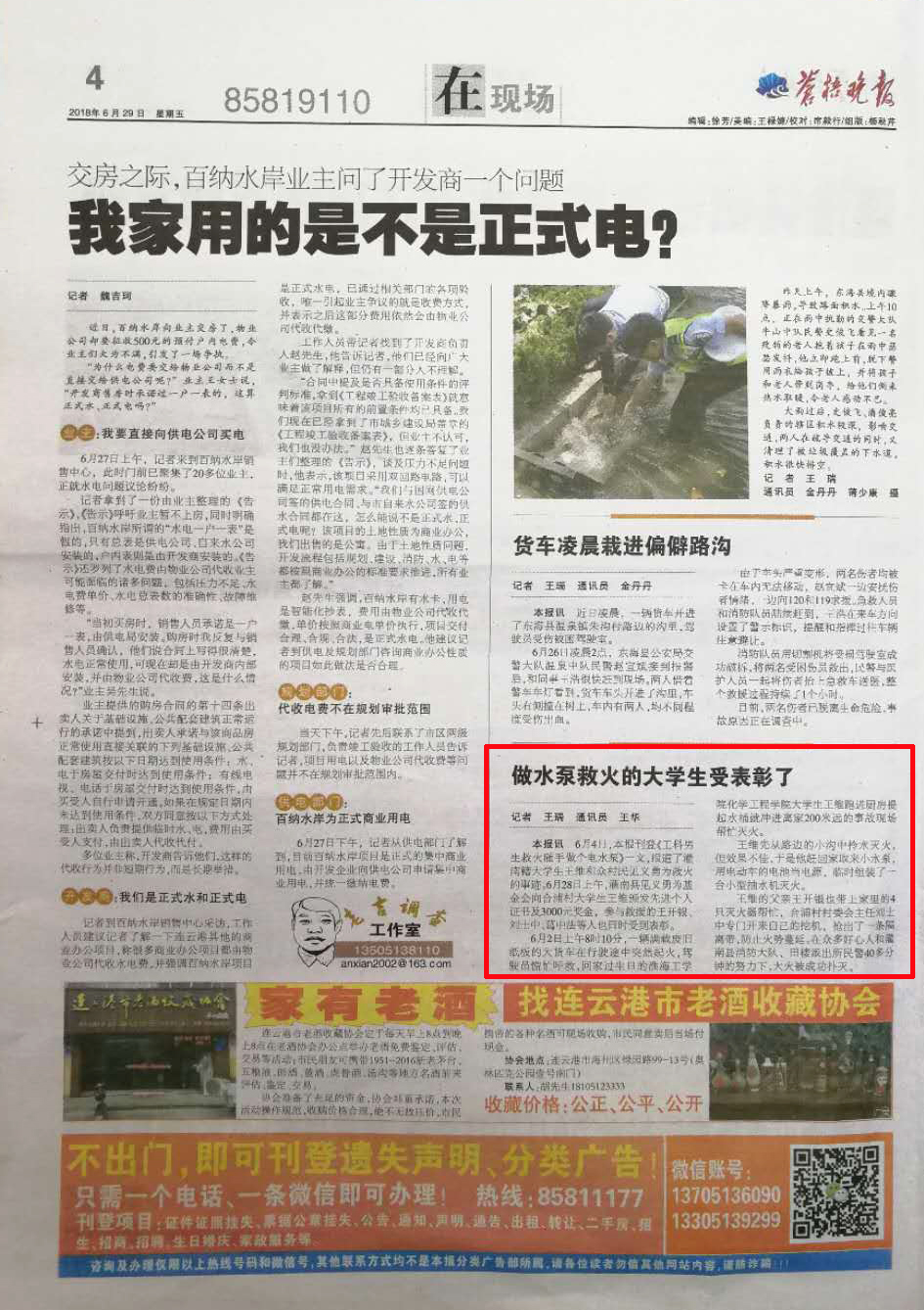 6月4日,本报刊登《工科男生救火随手做个电水泵》一文,报道了灌南籍大学生王维和众村民见义勇为救火的事迹。6月28日上午,灌南县见义勇为基金会向合浦村大学生王维颁发先进个人证书及3000元奖金,参与救援的王开银、刘士中、葛中法等人也同时受到表彰。