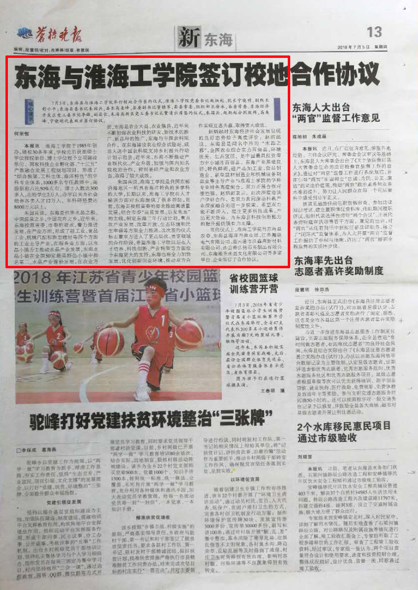 7月3日,东海县与淮海工学院举行校地合作签约仪式。淮海工学院党委书记赵炳起、院长宁晓明、副院长舒小平;东海县委书记朱国兵,县长高美峰,县委副书记董桂军,县委常委、组织部长徐冰,县委常委、东海经济开发区党工委书记李锋,副县长、东海高新区党工委书记孔繁清出席签约仪式。朱国兵、赵炳起分别致辞,高美峰、宁晓明代表双方签订协议。