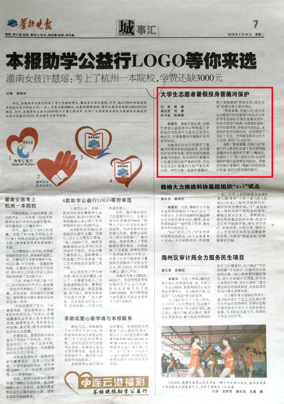 暑假开始以来,市绿色希望公益服务中心和淮海工学院海洋学院青年志愿者走进西大岭社区,开展蔷薇河环境保护系列宣传活动。