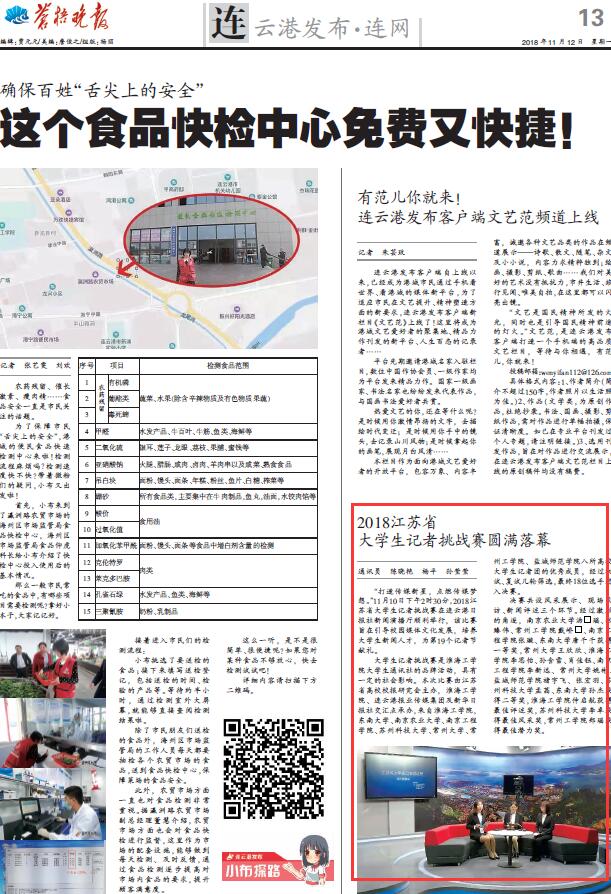 “打造传媒新星,点燃传媒梦想。”11月10日下午2时30分,2018江苏省大学生记者挑战赛在连云港日报社新闻演播厅顺利举行,该比赛旨在引导校园媒体文化发展,培养大学生新闻人才,为第19个记者节献礼。