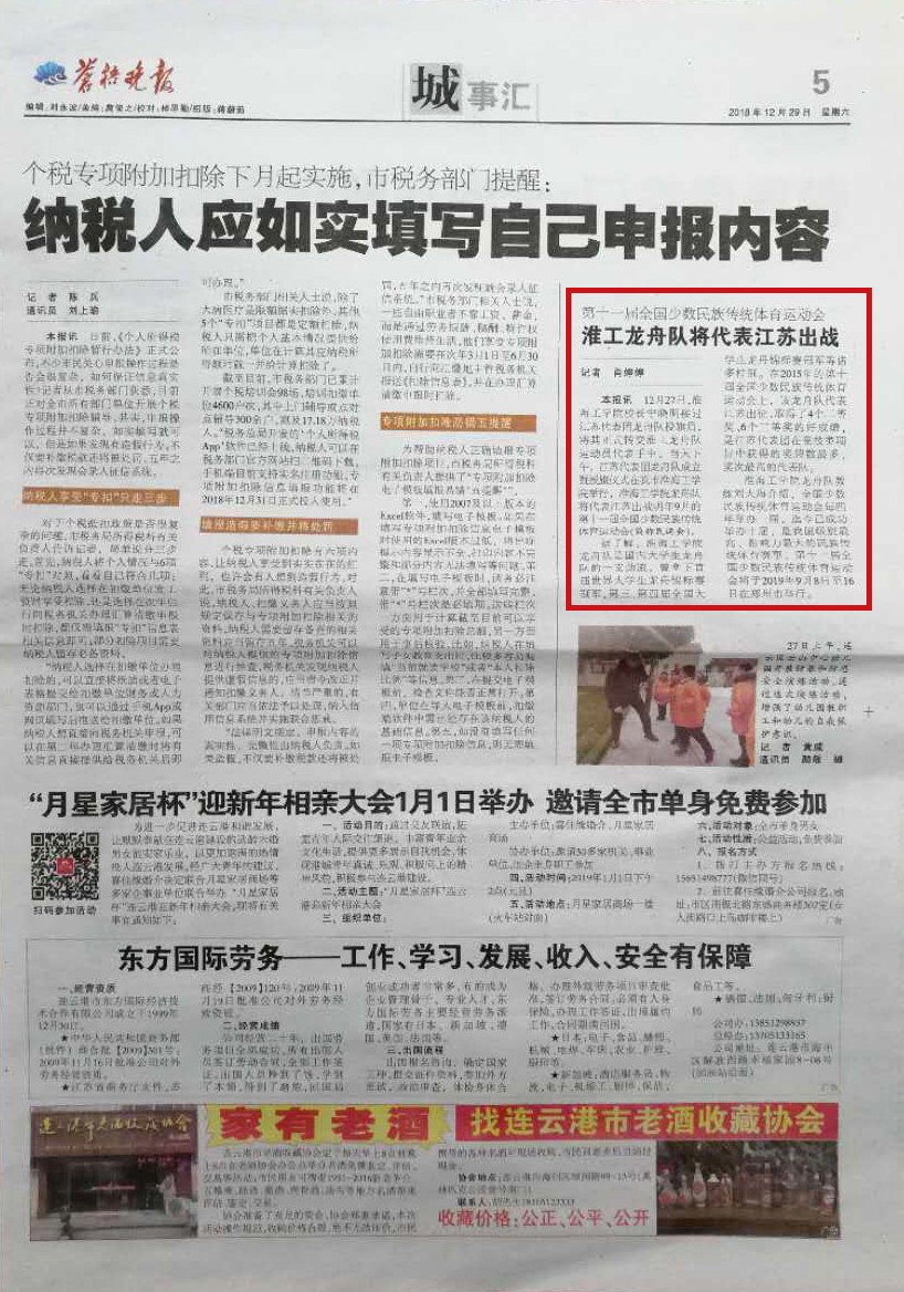 淮海工学院龙舟队教练刘大海介绍,全国少数民族传统体育运动会每四年举办一届,迄今已成功举办十届,是我国级別最高、影响力最大的民族传统体育赛事。第十一届全国少数民族传统体育运动会将于2019年9月8日至16日在郑州市举行。
