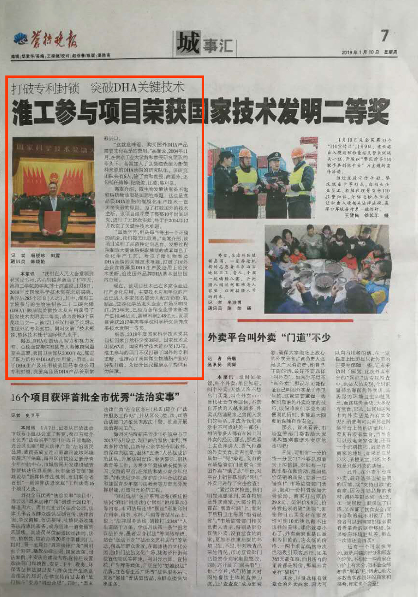 据悉,2018年度国家科学技术奖共包括国家自然科学奖38项,国家技术发明奖67项,国家科学技术进步奖173项。淮工参与的项目不仅打破了国外的专利垄断,也推动了我国微生物油脂产业的转型升级,为提升国民健康水平提供有力保障。
