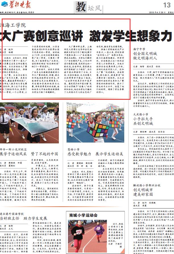 4月24日,淮海工学院举行了第十一届大广赛江苏赛区名家名师创意巡讲活动,本次活动由大广赛江苏赛区组委会主办,淮海工学院文学院承办。