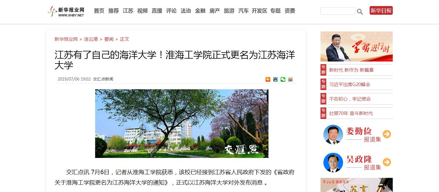7月6日,记者从淮海工学院获悉,该校已经接到江苏省人民政府下发的《省政府关于淮海工学院更名为江苏海洋大学的通知》,正式以江苏海洋大学对外发布消息 。