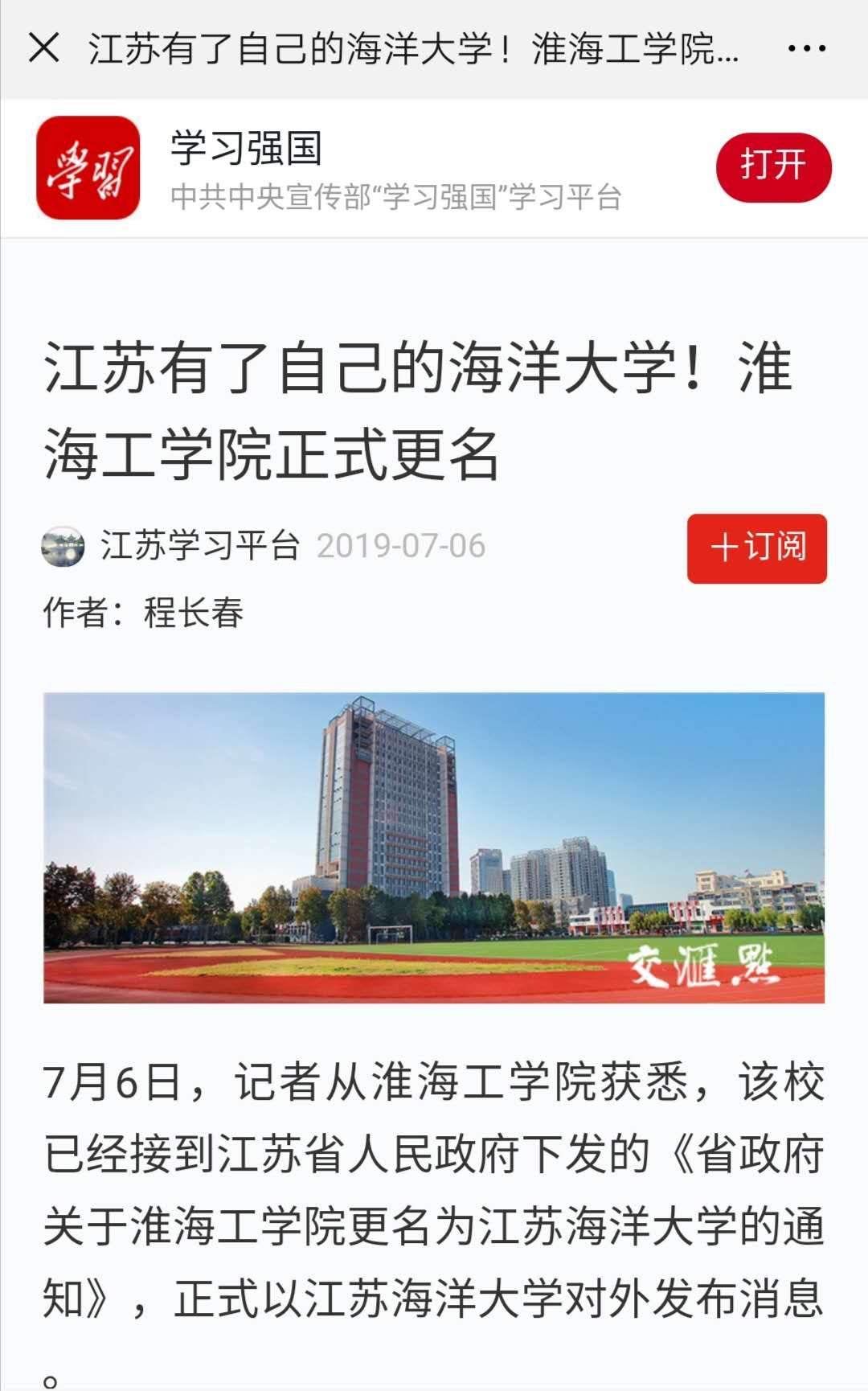 7月6日,记者从淮海工学院获悉,该校已经接到江苏省人民政府下发的《省政府关于淮海工学院更名为江苏海洋大学的通知》,正式以江苏海洋大学对外发布消息 。