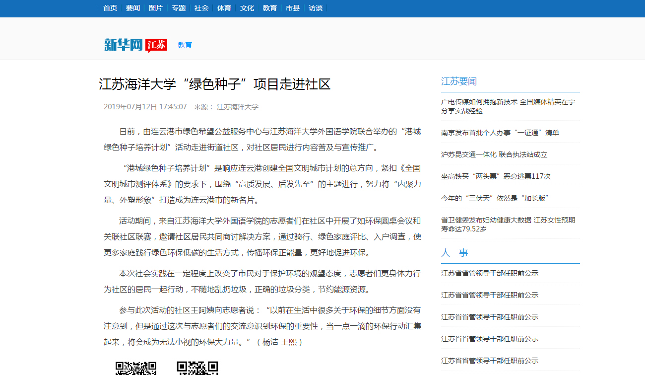 日前,由连云港市绿色希望公益服务中心与江苏海洋大学外国语学院联合举办的“港城绿色种子培养计划”活动走进街道社区,对社区居民进行内容普及与宣传推广。