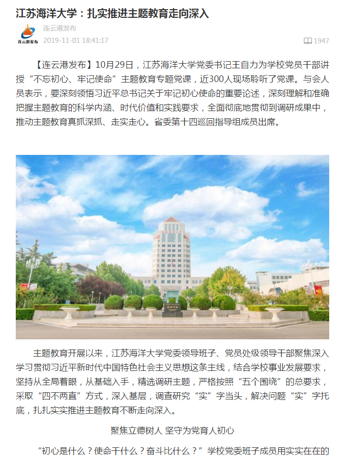 “初心是什么?使命干什么?奋斗比什么?”学校党委班子成员用实实在在的调研成果回答了这个问题,“对于江苏海洋大学而言,落实立德树人根本任务,为党育人、为国育才,培养德智体美劳全面发展的社会主义建设者和接班人,为国家‘海洋强国’战略和‘一带一路’建设,紧密结合区域和地方经济社会发展服务,建设高水平应用研究型海洋大学,就是我们的初心和使命。”