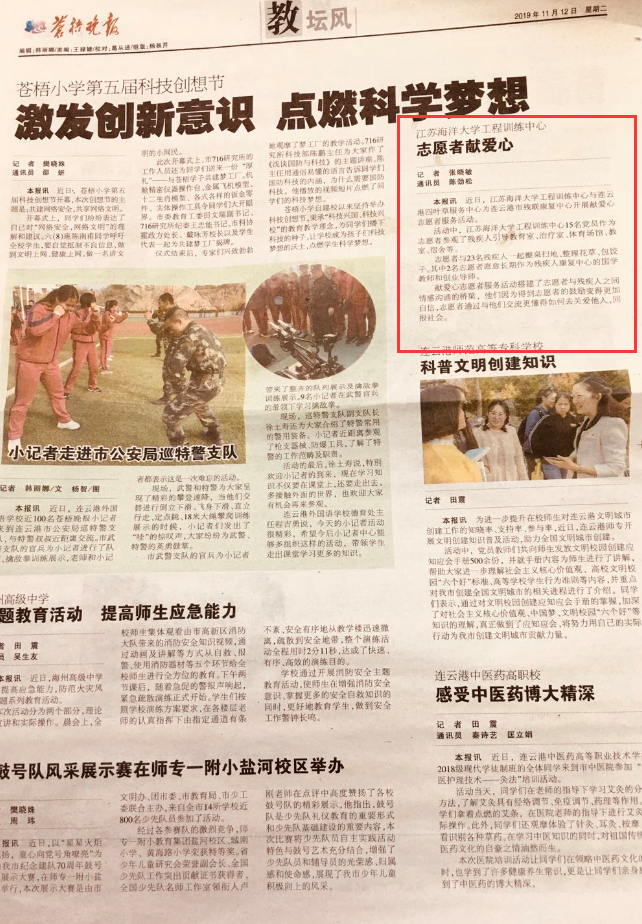 近日,江苏海洋大学工程训练中心与连云港四叶草服务中心为连云港市残联康复中心开展献爱心志愿者服务活动。