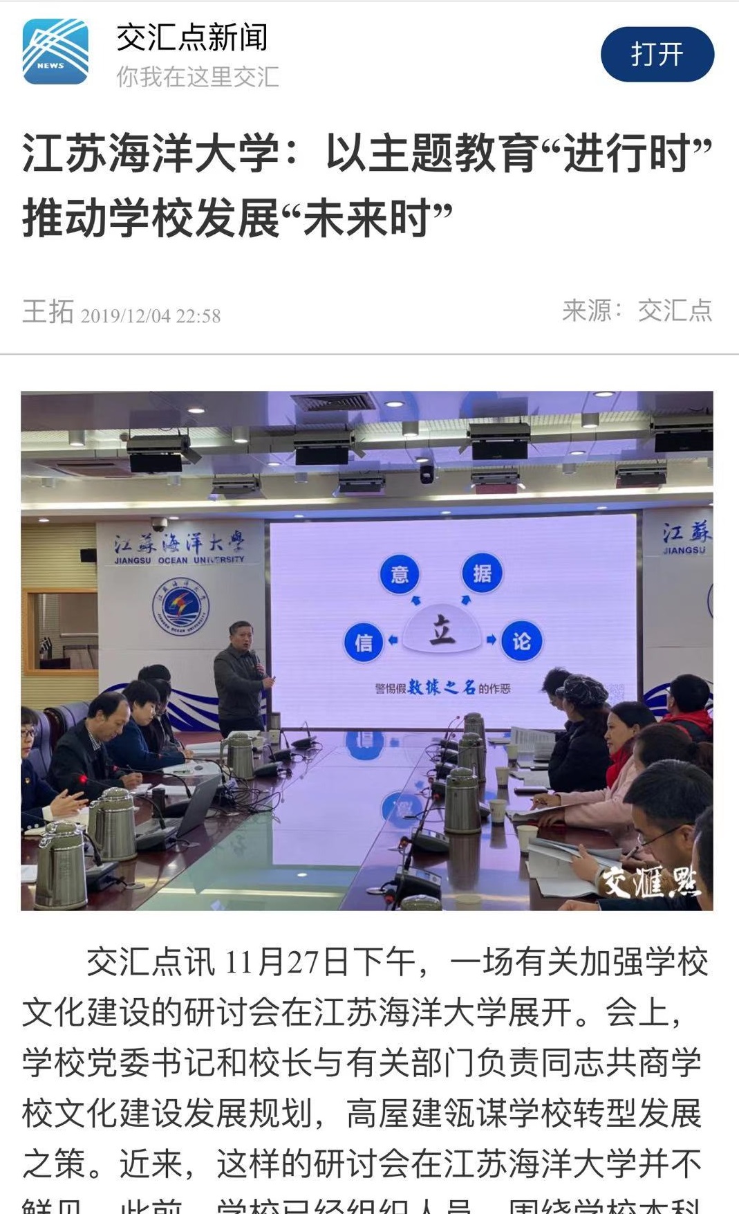 11月27日下午,一场有关加强学校文化建设的研讨会在江苏海洋大学展开。会上,学校党委书记和校长与有关部门负责同志共商学校文化建设发展规划,高屋建瓴谋学校转型发展之策。近来,这样的研讨会在江苏海洋大学并不鲜见。此前,学校已经组织人员,围绕学校本科教育、学科建设、科技创新、师资队伍建设等重点领域发展问题进行了两轮研讨。