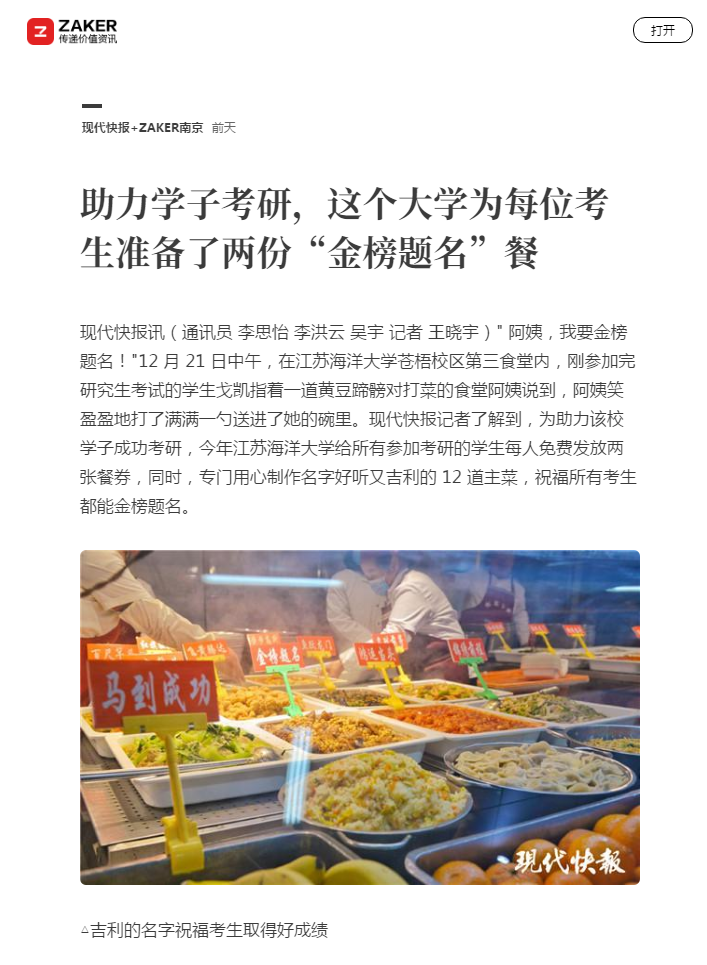 12 月 21 日是 2020 年全国硕士研究生入学考试的第一天。为了给学校考研学子加油鼓劲,江苏海洋大学在校领导的关心和支持下,饮食服务总公司在苍梧校区第三食堂开设了 7、8、9 三个专门窗口,为考研学生提供了免费的金榜题名餐 " 助力 "。
