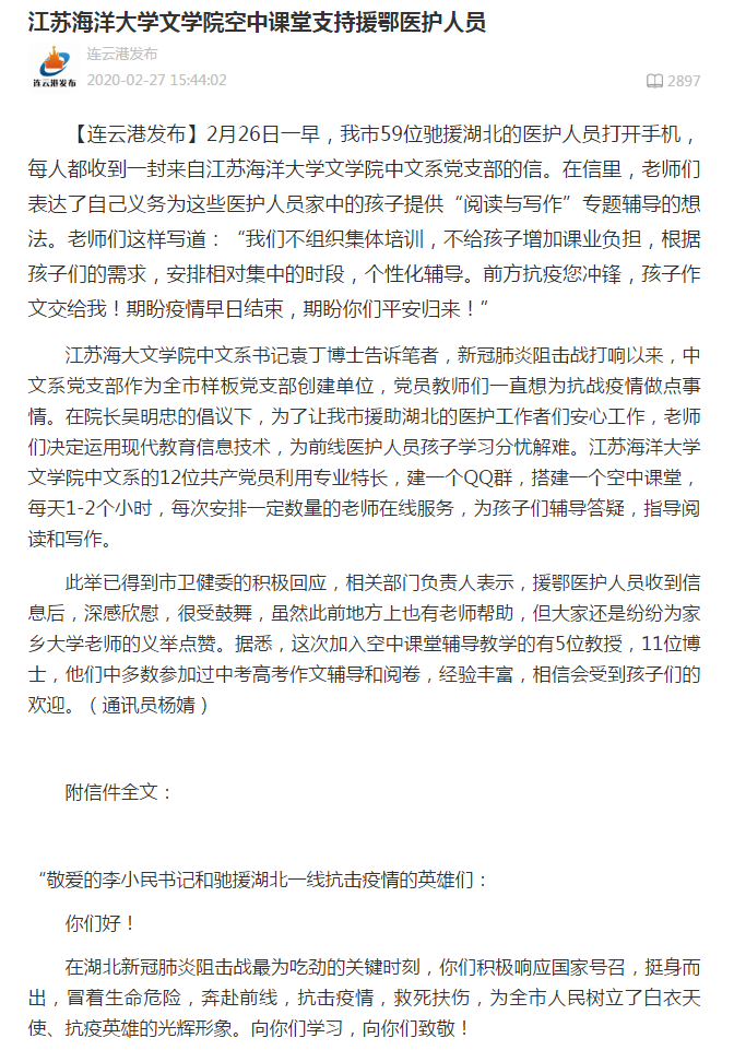 2月26日一早,我市59位驰援湖北的医护人员打开手机,每人都收到一封来自江苏海洋大学文学院中文系党支部的信。在信里,老师们表达了自己义务为这些医护人员家中的孩子提供“阅读与写作”专题辅导的想法。老师们这样写道:“我们不组织集体培训,不给孩子增加课业负担,根据孩子们的需求,安排相对集中的时段,个性化辅导。前方抗疫您冲锋,孩子作文交给我!期盼疫情早日结束,期盼你们平安归来!”