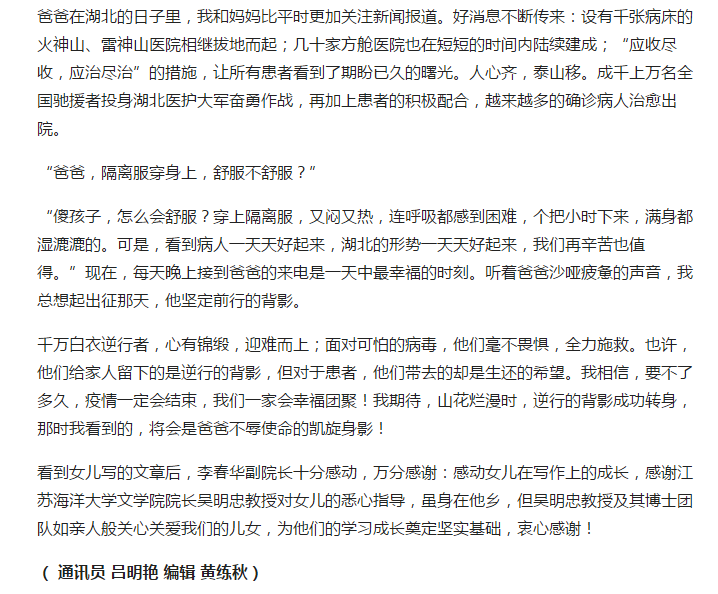 得知这一消息后,吴明忠院长在今日头条评论区留言“首先祝贺前方疫情阻击战胜利在望。致敬李春华医生和他的战友们。其次,祝贺沐阳同学的习作得以在今日头条发表。这是她自己勤思好学的结果,是李医生言传身教的结果。我们做老师的,只是在旁边给孩子一些提醒和引导。期待李医生平安凯旋,祝福你们和所有医护人员及家人全家安康!”