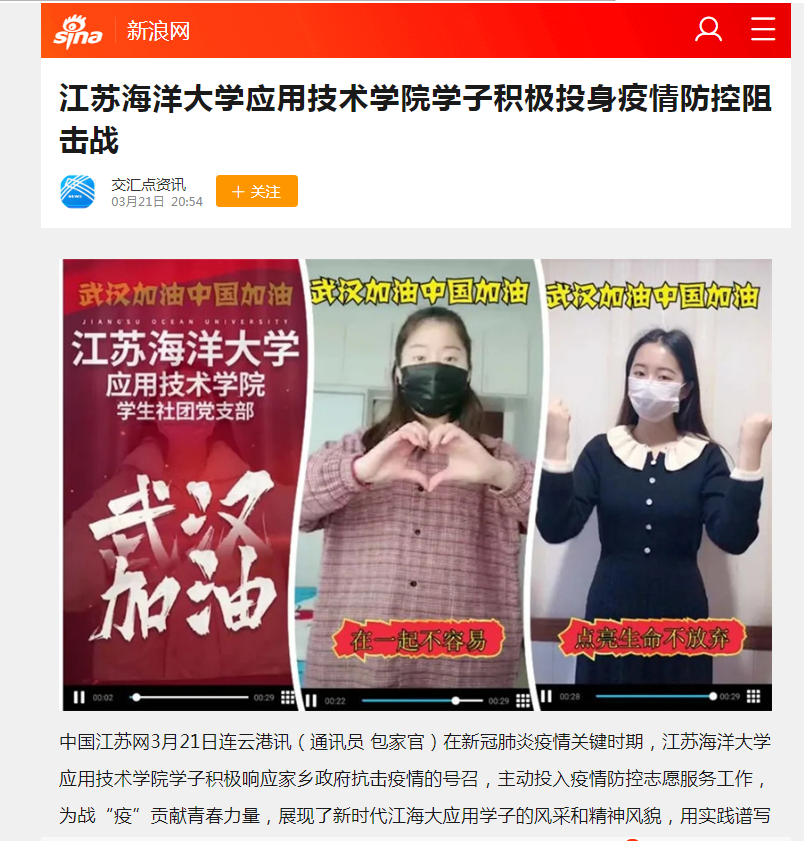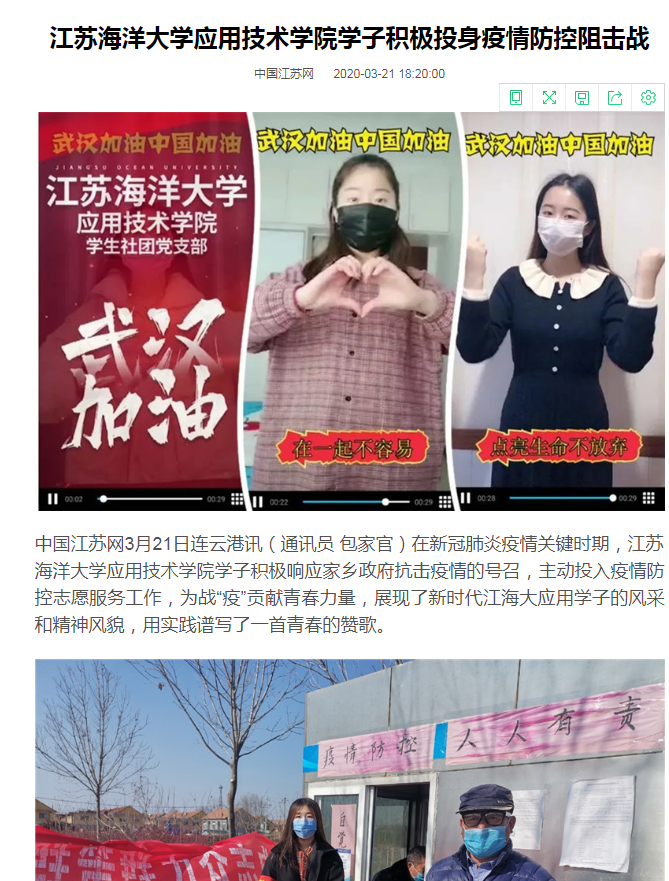 在新冠肺炎疫情关键时期,江苏海洋大学应用技术学院学子积极响应家乡政府抗击疫情的号召,主动投入疫情防控志愿服务工作,为战“疫”贡献青春力量,展现了新时代江海大应用学子的风采和精神风貌,用实践谱写了一首青春的赞歌。