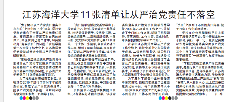 “为了解决从严治党责任落实中存在的‘上热中温下冷’现象,学校党委制定出台了全面从严治党责任清单。要把清单内容落实到自己的岗位上、体现在自己的工作中,切实解决好‘夯实责任’的问题。”在新学期第一次全校干部大会上,江苏海洋大学党委就对推进全面从严治党提出明确要求。
