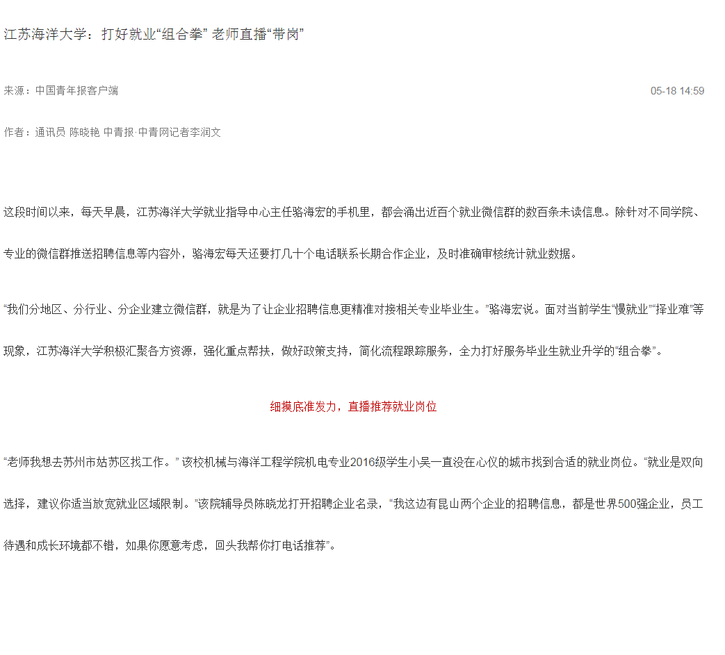 “我们分地区、分行业、分企业建立微信群,就是为了让企业招聘信息更精准对接相关专业毕业生。”骆海宏说。面对当前学生“慢就业”“择业难”等现象,江苏海洋大学积极汇聚各方资源,强化重点帮扶,做好政策支持,简化流程跟踪服务,全力打好服务毕业生就业升学的“组合拳”。