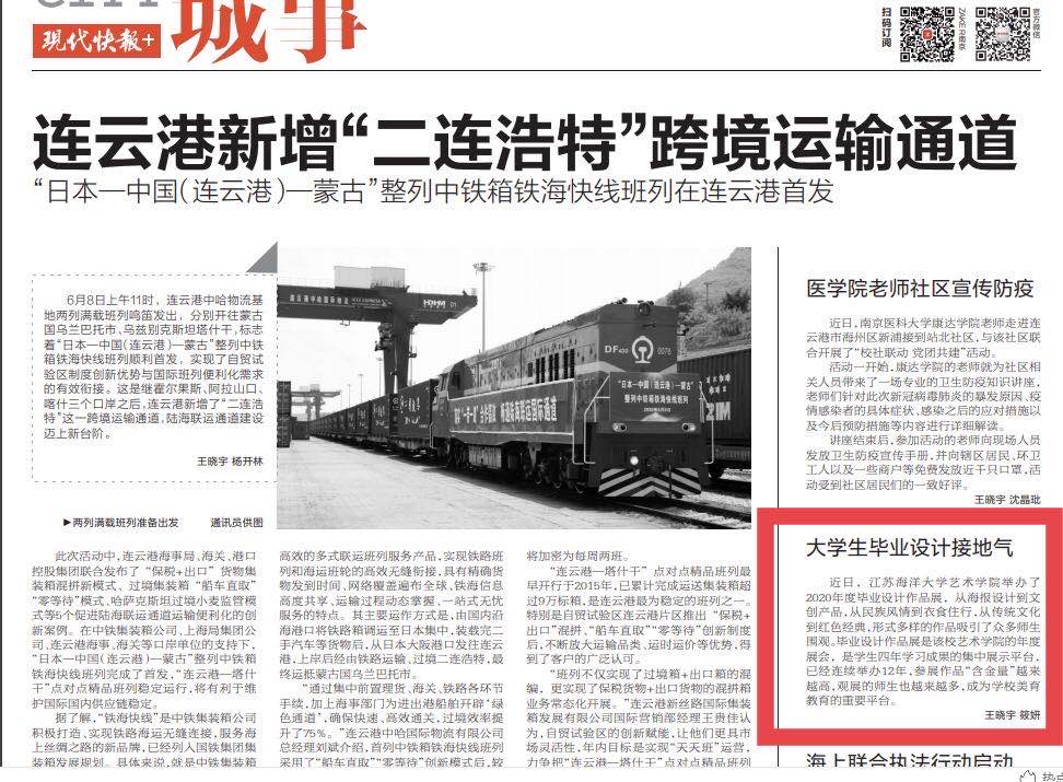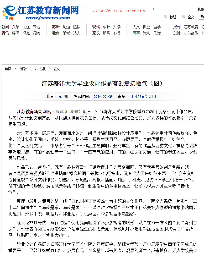 近日,江苏海洋大学艺术学院举办2020年度毕业设计作品展,从海报设计到文创产品,从民族风情到衣食住行,从传统文化到红色经典,形式多样的作品吸引了众多师生围观。