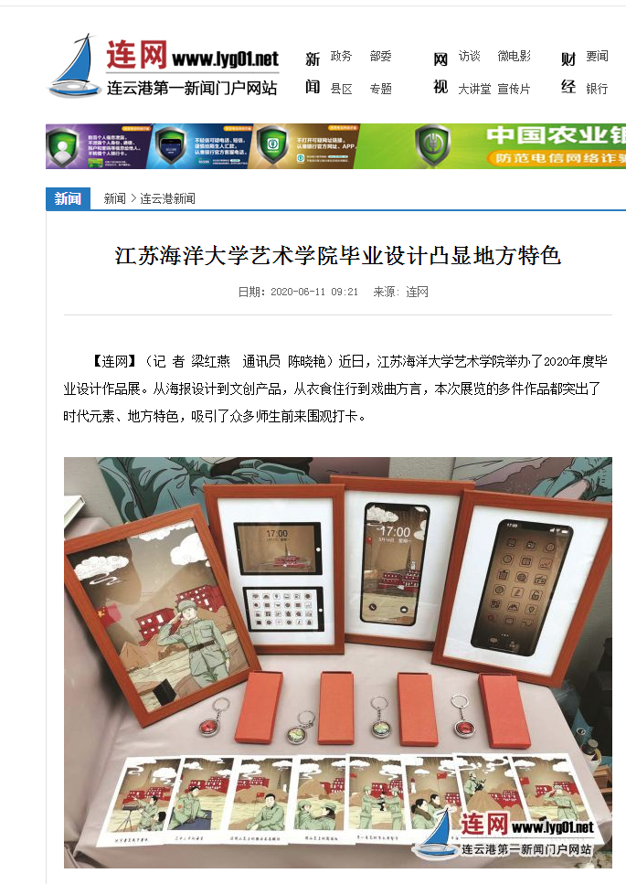 近日,江苏海洋大学艺术学院举办了2020年度毕业设计作品展。从海报设计到文创产品,从衣食住行到戏曲方言,本次展览的多件作品都突出了时代元素、地方特色,吸引了众多师生前来围观打卡。