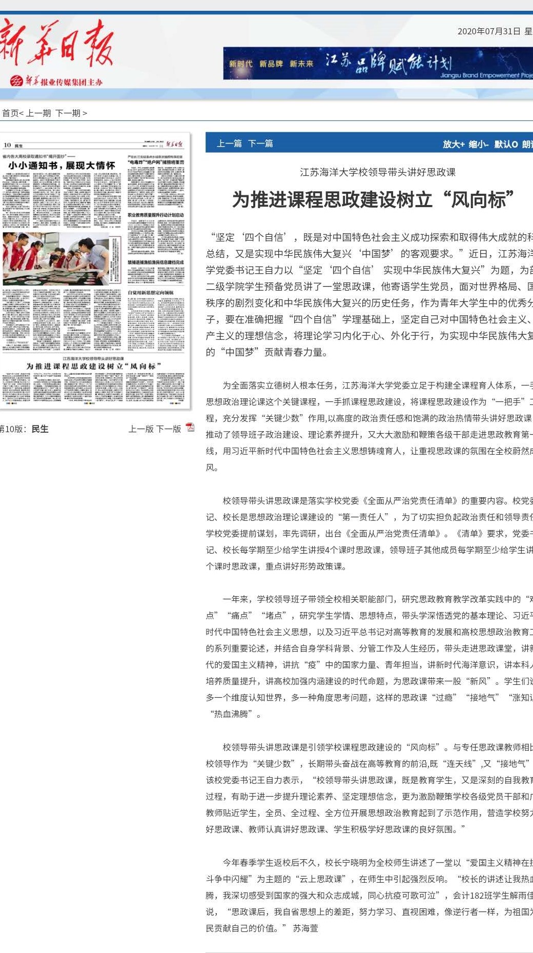 为全面落实立德树人根本任务,江苏海洋大学党委立足于构建全课程育人体系,一手抓思想政治理论课这个关键课程,一手抓课程思政建设,将课程思政建设作为“一把手”工程,充分发挥“关键少数”作用,以高度的政治责任感和饱满的政治热情带头讲好思政课,既推动了领导班子政治建设、理论素养提升,又大大激励和鞭策各级干部走进思政教育第一线,用习近平新时代中国特色社会主义思想铸魂育人,让重视思政课的氛围在全校蔚然成风。