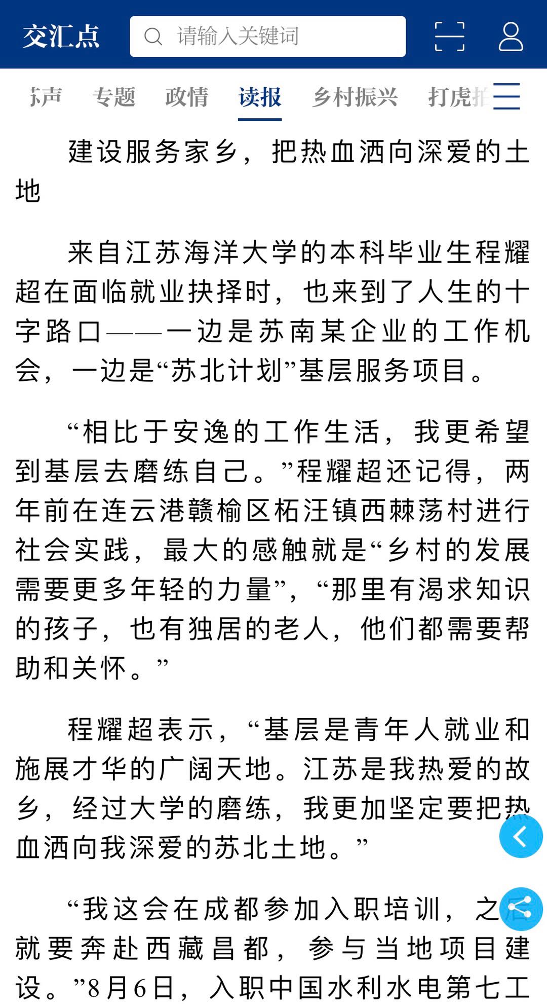 程耀超表示,“基层是青年人就业和施展才华的广阔天地。江苏是我热爱的故乡,经过大学的磨练,我更加坚定要把热血洒向我深爱的苏北土地。”