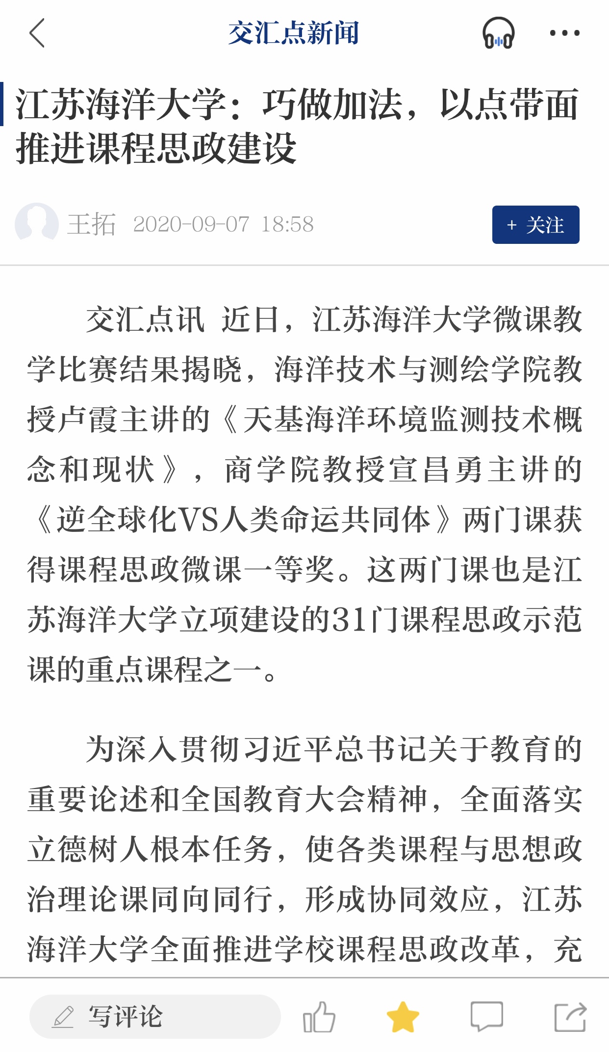 为深入贯彻习近平总书记关于教育的重要论述和全国教育大会精神,全面落实立德树人根本任务,使各类课程与思想政治理论课同向同行,形成协同效应,江苏海洋大学全面推进学校课程思政改革,充分挖掘各门课程思想政治资源,不断探索课程思政建设之路,逐步形成了以点带面、层层递进、成效显著的课程思政建设格局。