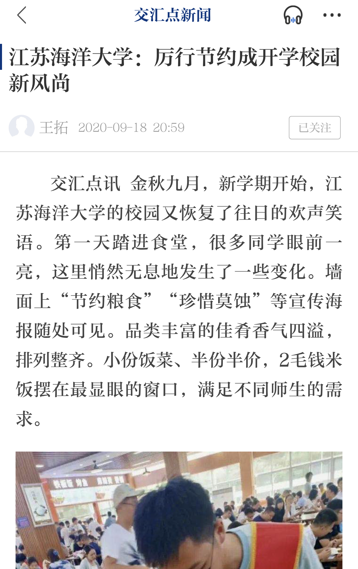 新学期开学后,江苏海洋大学开展了各种形式的“光盘行动”, 饮食服务总公司、学生处、校团委、校学生会共同发起倡议,号召广大师生“传承美德,做简朴俭约的传承者;抵制浪费,做节约粮食的示范者;以身作则,做文明新风的践行者。”