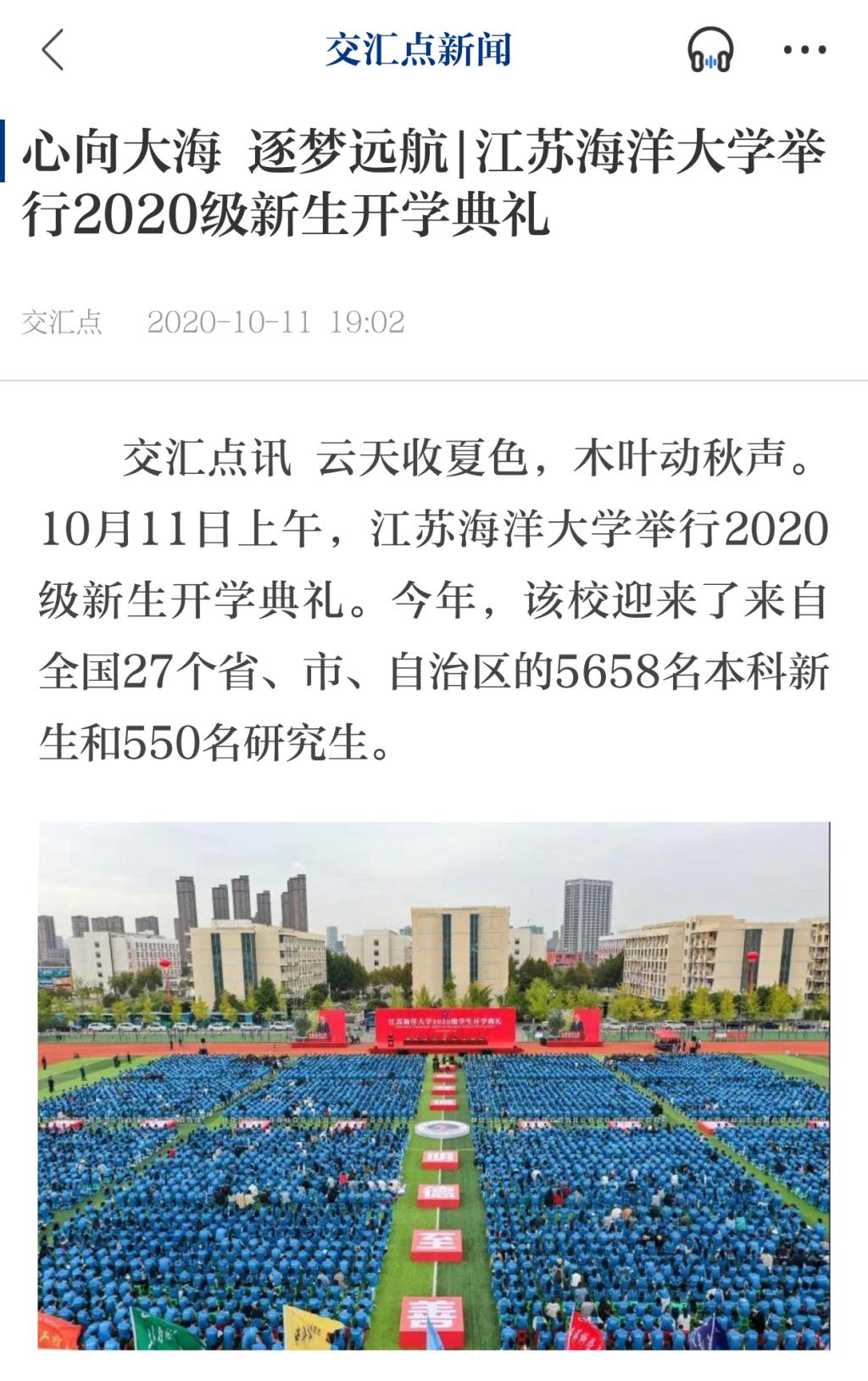 云天收夏色,木叶动秋声。10月11日上午,江苏海洋大学举行2020级新生开学典礼。今年,该校迎来了来自全国27个省、市、自治区的5658名本科新生和550名研究生。