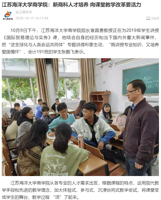 10月9日下午,江苏海洋大学商学院院长宣昌勇教授正在为2019级学生讲授《国际贸易理论与实务》课,他结合自身的经历和当下国内外重大新闻事件,把“逆全球化与人类命运共同体”专题讲得形象生动,“既讲授专业知识,又培养爱国情怀”,会计191班的学生张鹏飞表示。