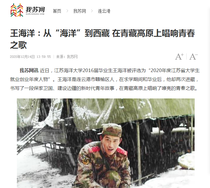 对于王海洋而言,第一次与西藏结缘,是难忘的参军入伍经历。2009年11月,正在无锡求学的王海洋报名参军,远赴西藏,成为一名保家卫国的武警战士。2010年4月底,王海洋被派往四川阿坝藏族羌族自治州执行重要任务。在一次执行任务中,他被挑选为一线作战人员编入抓捕组,并圆满完成任务,火线荣记“三等功”,成了当时全营参与此次任务中唯一立功的义务兵。凭借出色的表现,2011年10月,王海洋成为一名共产党员。